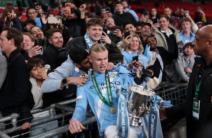 魔人无语了!哈兰德拿着奖杯与球迷合影,遭一男球迷强吻